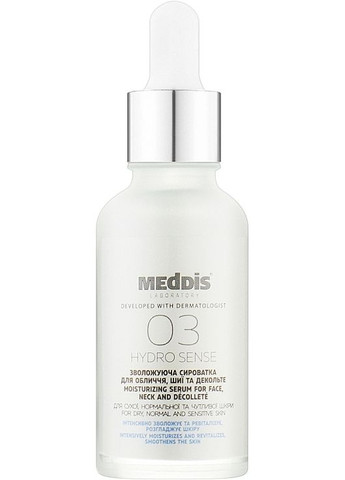 З цією зволожувальною сироваткою для обличчя, шиї та зони декольте від українського бренда Meddis ви відчуєте, як до шкіри повертається відчуття м'якості та комфорту. Завдяки особливому складу вона миттєво відновлює гідробаланс та дарує здорове сяйво. Засіб швидко всотується, не залишаючи жирності та липкості, що робить її ідеальним вибором для щоденного використання. Дія сироватки спрямована на глибоке зволоження, підвищення стійкості до зовнішніх факторів стресу. Вона також допомагає зменшити недосконалості, такі як легкі запалення, пігментні плями й нерівності тону, роблячи обличчя чистішим і здоровішим на вигляд. Тонкі зморшки стають менш помітними, а антиоксидантний захист зміцнює шкіру та протидіє передчасному старінню. Особливості Meddis Hydrosense Moisturizing Serum For Face, Neck And Decollete: – призначено для нормальної, сухої та чутливої шкіри;– Hydagen Aqporin 3% забезпечує миттєве й тривале зволоження;– гіалуронова кислота 0,1% надає наповненого вигляду, розгладжує тонкі лінії зсередини;– Skinasensyl 0,5% знижує чутливість, підвищує стійкість до зовнішніх факторів стресу;– Smartvector UV 1% вивільнює антиоксиданти для захисту в момент потрапляння на шкіру УФ-променів;– ніацинамід 1% освітлює нерівності тону, зменшує запалення, стимулює вироблення природного колагену;– екстракт альпійської троянди 0,1% надає омолоджувального ефекту, позбавляючи епідерміс старих клітин.