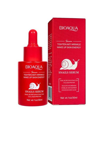 Сироватка Bioaqua Tighten Anti-Wrinkle Wake Up Skin Energy Snail Serum - це косметичний продукт, в якому активні компоненти містяться у високій концентрації. Вона спрямована на вирішення конкретного завдання, а саме на живлення та зволоження шкіри, на запобігання зморшкам, і тому необхідна як ефективне доповнення антивікових засобів денного та нічного догляду. Весь секрет сироватки активних інгредієнтах. Сироватка для обличчя Bioaqua містить фільтрат равликового муцину, що є її головним компонентом. Муцин широко використовується в косметології, тому що його користь для шкіри неоціненна, а сам він багатофункціональний. Муцин регулює водний баланс дерми, зменшує надмірну активність сальних залоз, підвищує пружність шкіри та сприяє здоровому кольору обличчя. Сироватка Bioaqua Tighten Anti-Wrinkle рекомендується в першу чергу людям із зневодненою шкірою, з віковими та передчасними зморшками, зі схильною до сухості шкірою. Так як муцин равлика має ранозагоювальну та протизапальну дію, то сироватка показана також і проблемній шкірі, з вуграми і висипаннями різного виду. Муцин равлика перешкоджає випаровуванню вологи зі шкіри, тому що створює тонку плівку після нанесення на шкіру, яка захищає від впливу навколишнього середовища, але й не заважає повітрообміну. Муцин равлика також стимулює синтез еластину та колагену в дермі, тому сироватка необхідна для підтримки краси та молодості шкіри всім, хто бажає якомога довше насолоджуватися гладкістю та свіжістю шкіри обличчя. Також не варто забувати, що всі косметичні засоби, як і сироватка, наносяться не тільки на обличчя, а й на шию. Сироватка з муцином равлика рекомендована після 25 років, людям із проблемною шкірою. Якщо у вас немає алергії на фільтрат секреції равлика, то сміливо можна використати сироватку, від неї ваша шкіра стане більш пружною та наповненою. Як користуватись сироваткою Bioaqua Tighten Anti-Wrinkle Wake Up Skin Energy Snail Serum? Нанести потрібну кількість засобу на чисту особу та шию, легко втерти масажними рухами до повного вбирання. Після сироватки використовувати крем або інші засоби догляду.
