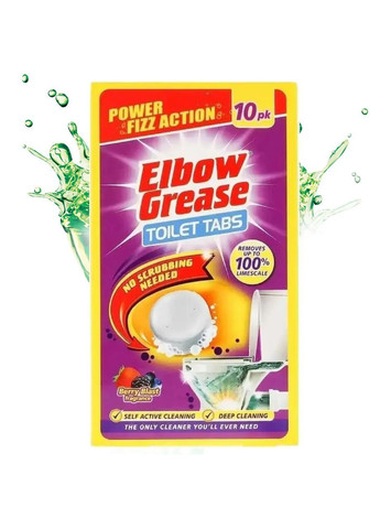 Таблетки для очищення унітаза Elbow Grease Toilet Tabs 10 шт. Таблетки Elbow Grease з яскравим ароматом Berry Blast! Ці інноваційні таблетки допоможуть вам змінити повсякденний догляд за вашим туалетом. Особливості: Таблетки ефективно очищають і дезодорують, забезпечуючи до 100% стійкий ефект. Легко використовувати: просто вставте одну таблетку в туалетний блок і нехай вона виконає свою магію. Формула бореться з важкими забрудненнями і вапняним нальотом, що дозволяє підтримувати чистоту та свіжість. Упаковка містить 10 таблеток, що забезпечує тривалий запас для ефективного очищення. Попрощайтесь з виснажливою чищенням! Подаруйте вашому туалету блискучу чистоту з Elbow Grease.