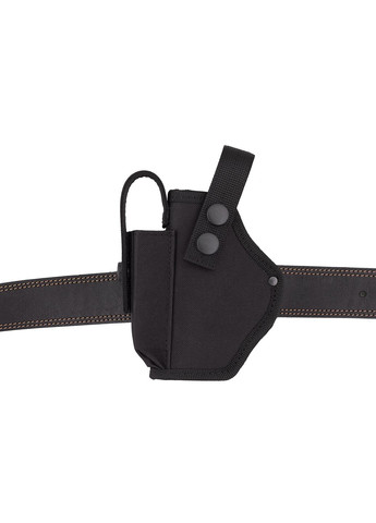 Кобура Шкіряна для Форт 12 поясна з чохлом під магазин Кобура виготовлена з щільної натуральної шкіри чорного кольору, товщиною 2,5-3,0 мм. скопійованої з оригінального пістолета. Кобура кріпиться на поясному ремені шириною до 5 см (портупейний, тактичний). На поясному ремені кобура фіксується з нахилом уперед під кутом приблизно 75 градусів до горизонталі. Хлястик кобури застібається на кільцеву кнопку. Відповідна частина кнопки хлястика втоплена урівень з поверхнею шкіри, і не заважає вилучення пістолета. Пістолет "сидить" в кобурі щільно.