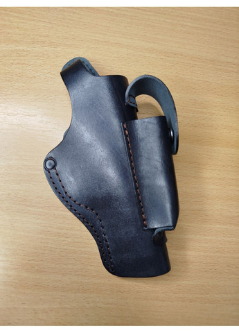 Кобура Шкіряна для Glock 17 поясна з чохлом під магазин Кобура виготовлена з щільної натуральної шкіри чорного кольору, товщиною 2,5-3,0 мм. скопійованої з оригінального пістолета. Кобура кріпиться на поясному ремені шириною до 5 см (портупейний, тактичний). На поясному ремені кобура фіксується з нахилом уперед під кутом приблизно 75 градусів до горизонталі. Хлястик кобури застібається на кільцеву кнопку. Відповідна частина кнопки хлястика втоплена урівень з поверхнею шкіри, і не заважає вилучення пістолета.