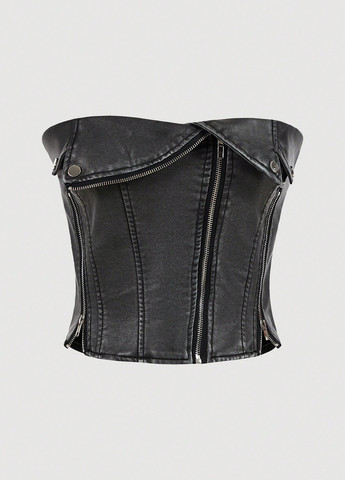 Slaydiva Plus Size. Цей корсетний топ забезпечує посадку, що облягає, для великих розмірів. Він виготовлений із злегка еластичної поліуретанової тканини. Дизайн відрізняється асиметричним подолом та квадратним вирізом. Він включає застібку-блискавку.
