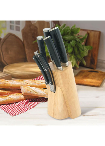 Набір кухонних ножів Maestro 8 предметів (MR-1423) Склад набору: Мусат (довжина точила: 20,5 см, довжина ручки: 10,5 см) Кухонні ножиці (розмір: 25,5х4 см); Ніж Santoku (японський) (довжина клинка: 17 см, довжина ручки: 14 см), Ніж універсальний (довжина клинка: 20 см, довжина ручки: 13 см) Ніж загального призначення (довжина клинка: 12,5 см, довжина ручки: 11 см) Ніж для хліба (довжина клинка 20 см, довжина ручки: 13 см) Ніж для чищення овочів (довжина клинка: 8,5 см, довжина ручки: 11 см) Дерев'яна колода (розмір: 21х22х14 см) Характеристики: Матеріал ножів: нержавіюча сталь Матеріал ручок: пластик Полірована поверхня Зручні ручки Прекрасне балансування Професійне заточування Ергономічний дизайн Набір ножів Maestro MR 1423 складається з 8 предметів: 5 ножів (включно з японським ножем для суші "Сантоку"), кухонні ножиці, мусат (точило), дерев'яна колода. Кухонні ножі виготовлені з високоякісної нержавіючої сталі, прекрасно відбалансовані та обладнані зручною ручкою. Дизайн ручки відповідає дизайну предметів, що продаються окремо, з кодами товару MR 154Х (де х цифра 1,2,3,0 у кожній конкретній моделі), що є приємним бонусом і дає змогу докупити предмети, що входять до складу цього набору за окремо. Набір кухонних ножів Maestro (MR-1423) — це незамінний помічник на вашій кухні, який поєднує стиль, функціональність і високу якість. Цей комплект із 8 предметів містить усе необхідне для справжньої кулінарної майстерності. Ніж Santoku для філігранного нарізування, універсальний ніж і ніж для чищення овочів полегшать будь-які завдання, а ніж для хліба забезпечить ідеально рівні скибочки. Кухонні ножиці та мусат для заточування підтримають ваші ножі в ідеальному стані, а дерев'яна колода додасть елегантності на кухонну стільницю. Ножі виготовлені з нержавіючої сталі з професійним заточуванням, що гарантує довговічність і ідеальну гостроту. Ергономічні пластикові ручки забезпечують комфорт під час кожного руху, а полірована поверхня надає набору витонченого вигляду. Прекрасне балансування кожного ножа створює відчуття впевненості та контролю. Цей набір стане справжньою родзинкою вашої кухні, даючи змогу готувати легко, швидко та із задоволенням. З Maestro (MR-1423) кожне приготування стане моментом творчості та насолоди!