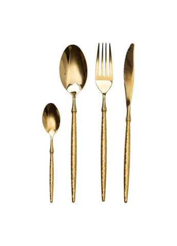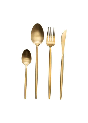 Набір столових приборів золотистого кольору складається з 24 предметів: 6 столових ложок, 6 чайних ложок, 6 виделок і 6 столових ножів. Кожен предмет має класичний дизайн без зайвих декоративних елементів, що робить їх універсальними для щоденного використання або сервірування святкового столу. Столові прибори мають гладку поліровану поверхню, яка легко очищається і не затримує забруднення. Основні характеристики: Кількість предметів у наборі: 24 шт; Кількість персон: 6; Матеріал: нержавіюча сталь; Упаковка: коробка; Розміри приладів: довжина столового ножа: 21.5 см; довжина столової ложки: 22.5 см; довжина столової виделки: 22 см; довжина чайної ложки: 14.5 см. Комплектація набору: столовий ніж: 6 шт; столова ложка: 6 шт; столова виделка: 6 шт; чайна ложка: 6 шт. Матеріал виготовлення - нержавіюча сталь, яка вирізняється міцністю, стійкістю до корозії та довговічністю. Леза ножів мають заточену кромку, що забезпечує зручне нарізування продуктів. Вилки та ложки мають ергономічну форму, що сприяє комфортному утриманню в руці під час прийому їжі. Усі предмети набору можна мити в посудомийній машині без ризику втрати блиску або пошкодження поверхні. Комплект поставляється в базовій упаковці, яка захищає прилади від механічних пошкоджень під час транспортування. Набір підходить для використання в домашніх умовах, закладах громадського харчування або як варіант для тимчасового житла. Завдяки стандартним розмірам і нейтральному дизайну ці столові прибори легко поєднуються з різними стилями посуду та текстилю для сервірування столу.