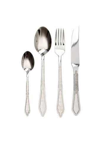 Набір столових приборів складається з 24 предметів, розрахованих на 6 персон. До комплекту входять 6 столових ложок, 6 чайних ложок, 6 виделок і 6 столових ножів. Усі елементи виготовлені з неіржавкої сталі, що забезпечує їхню міцність і стійкість до корозії. Основні характеристики: Кількість предметів у наборі: 24 шт; Кількість персон: 6; Матеріал: нержавіюча сталь; Упаковка: коробка; Розміри приладів: довжина столового ножа: 22.5 см; довжина столової ложки: 21.1 см; довжина столової виделки: 21 см; довжина чайної ложки: 15 см. Комплектація набору: столовий ніж: 6 шт; столова ложка: 6 шт; столова виделка: 6 шт; чайна ложка: 6 шт. Форма приладів відповідає стандартам ергономіки, що сприяє зручному використанню під час щоденних прийомів їжі. Ложки мають плавні контури, виделки оснащені рівномірно загостреними зубцями, а ножі розроблені для ефективної нарізки продуктів. Гладка поверхня і збалансована вага кожного предмета забезпечують комфорт у використанні. Прилади виконані в сріблястому кольорі. Завдяки класичному дизайну набір підходить як для повсякденного використання, так і для сервірування святкового столу. Вироби придатні для миття в посудомийній машині відповідно до рекомендацій виробника.