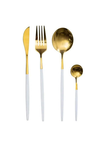 Набір столових приборів містить 24 предмети, призначені для обслуговування 6 персон. До комплекту входять 6 столових ложок, 6 чайних ложок, 6 виделок і 6 столових ножів. Основна частина приладів має золотистий відтінок, а ручки виконані в білому кольорі, що створює контрастний і стриманий вигляд. Основні характеристики: Кількість предметів у наборі: 24 шт; Кількість персон: 6; Матеріал: нержавіюча сталь; Упаковка: коробка; Розміри приладів: довжина столового ножа: 22.5 см; довжина столової ложки: 20.8 см; довжина столової виделки: 21.5 см; довжина чайної ложки: 12.8 см. Комплектація набору: столовий ніж: 6 шт; столова ложка: 6 шт; столова виделка: 6 шт; чайна ложка: 6 шт. Матеріалом виготовлення є нержавіюча сталь, яка забезпечує стійкість до корозії та механічних пошкоджень. Поверхня гладенька, що полегшує очищення та догляд. Білі ручки мають ергономічну форму, що сприяє зручному захопленню та комфортному використанню. Комплект підходить як для щоденного застосування, так і для сервірування святкового столу. Завдяки поєднанню золотистої сталі з білими ручками, прилади гармонійно вписуються в сучасний інтер'єр кухні та можуть комбінуватися з різними видами посуду.