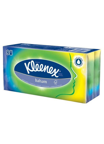 Носові хусточки Kleenex (Клінекс) Balsam м'які та міцні, що робить їх незамінними помічниками у повсякденному житті. Основні переваги: допоможуть відчути полегшення та комфорт під час прикрої нежиті через хворобу чи алергію м'яка паперова основа просочена бальзамом з екстрактом календули, який заспокоює подразнену шкіру та запобігає почервонінню не мають запаху та підходять для чутливого епідермісу відмінно вбирають виділення компактна упаковка знайде своє місце як у кишені, так і в шухляді столу, щоб у потрібний час перебувати під рукою Характеристики Кількість: 72 шт. (8 упаковок по 9 шт.) Розмір 1 хусточки: 20х20 см Кількість шарів: 4 Виробник: Kleenex, Італія.