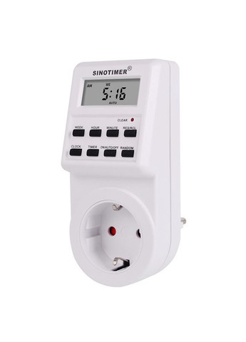 Розетка з цифровим тижневим таймером Sinotimer TM519 – це зручний та функціональний пристрій, що дозволяє автоматизувати увімкнення та вимкнення електроприладів залежно від заданого розкладу. За допомогою цієї розетки ви зможете: - Заощаджувати електроенергію, включаючи прилади лише на потрібний час. - Автоматизувати роботу освітлення, систем опалення, поливу та інших пристроїв. - Створити ефект присутності у будинку під час вашої відсутності. - Підвищити рівень комфорту, запрограмувавши увімкнення/вимкнення приладів на зручний для вас час. Характеристики: - Тип: розетка з таймером - Модель: Sinotimer TM519 - Напруга: 230V - Максимальне навантаження: 3000W - Максимальний струм: 16A - Тип таймера: цифровий, тижневий - Кількість програм: до 16 програм (8 вкл/8 вимк) - Мінімальний інтервал установки: 1 хвилина - Функція випадкового увімкнення/вимкнення: є - Функція переходу на літній/зимовий час: є - Дисплей: LCD - Індикація: включення, роботи програми - Матеріал корпусу: ABS пластик - Колір білий - Розміри: 65х65х135 мм - Вага: 150 г особливості: - Просте та інтуїтивно зрозуміле управління. - Можливість встановлення до 16 програм увімкнення/вимкнення. - Мінімальний інтервал встановлення часу – 1 хвилина. - Функція випадкового увімкнення/вимкнення для імітації присутності в будинку. - Функція переходу на літній/зимовий час. - Наявність LCD дисплея та індикації режимів роботи. - Компактний розмір та стильний дизайн. - Висока надійність та безпека. Комплектація: - Розетка із таймером Sinotimer TM519 – 1 шт. - Інструкція з експлуатації – 1 шт.