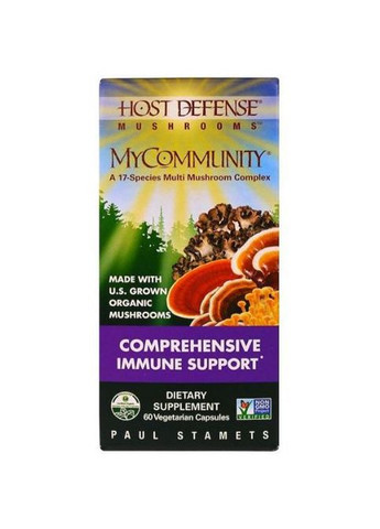 Особливості: Комплекс з 17 видів грибів Комплексна підтримка імунітету Харчова добавка Відсутність ГМО підтверджено сертифікатом MyCommunity - це формула Host Defense з 17 видів грибів, спочатку створена Полом Стаметсом (Paul Stamets), є самою універсальною формулою Host Defense для захисту імунітету. Рекомендації щодо застосування В якості харчової добавки приймати по 2 капсули в день. Можна приймати з їжею, натщесерце або за рекомендацією лікаря Інші інгредієнти Сублімований міцеллірованний бурий рис, пуллулан (позаклітинний полісахарид) Попередження Проконсультуйтеся з консультантом з питань охорони здоров'я щодо використання цього продукту під час вагітності. Зберігати в недоступному для дітей.