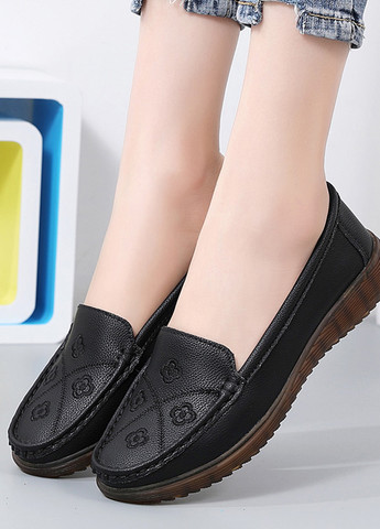 Жіночі лофери доступні для теплої погоди. Взуття виконане з м'якої шкіри, що дихає, і плоского дизайну. Мають гумову підошву та тканинні устілки. Верх виконаний із PU шкіри чорного кольору.