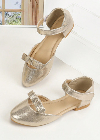 Модні дитячі туфлі на плоскому носі, призначені для повсякденного носіння. Взуття має золотистий ремінець на кісточці з бантом та однотонним візерунком. Виготовлені із зручних матеріалів, включаючи підошву з TPR, устілку із PU шкіри та верх із поліестеру.