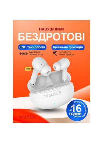 Навушники Bluetooth WALKER WTS-60 ENC – це пристрій, який використовується для прослуховування аудіо/відео або телефонних розмов. Бездротові навушники підключаються до мобільних гаджетів (плеєр, смартфон та інші девайси) за допомогою технології Bluetooth. Вони забезпечують чудову якість звуку з глибокими басами та чіткими високими частотами, дозволяючи насолоджуватися музикою у будь-якому місці та в будь-який час. Навушники створені з міцних матеріалів і мають зручний, стильний дизайн. Ергономічна форма забезпечує ідеальне прилягання до вух та максимальний комфорт. Ключові переваги: Автоматичне підключення: Навушники оснащені технологією Bluetooth 5.3, що забезпечує швидке підключення до смартфона або іншого пристрою, стабільний зв'язок та високу швидкість передачі даних. Зручне носіння: Ергономічний дизайн дозволяє комфортно користуватися навушниками протягом тривалого часу, забезпечуючи їх надійне фіксування навіть під час активного руху. Сенсорне управління: Дозволяє зручно виконувати основні дії, такі як перемотування або перемикання треків, прийом чи відхилення дзвінків одним дотиком. Потужний 10 мм динамік: Забезпечує глибокі баси та високу якість звуку. Захист від вологи: Відповідність стандарту IPX4 робить навушники ідеальним вибором для активного способу життя. Шумопоглинання AI ENC: Використання штучного інтелекту для усунення фонових шумів, що гарантує чистий і чіткий звук під час розмов. Комплектація: Коробка Навушники WALKER WTS-60 ENC Зарядний кабель Інструкція Гарантія: 24 місяці Увага! Перед початком використання обов’язково зніміть захисну плівку з контактів навушників — її наявність може блокувати підключення по Bluetooth