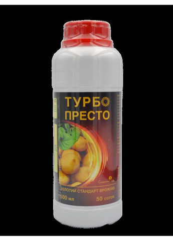 Новітній системний інсектицид для довготривалого захисту всіх культур ТУРБО ПРЕСТО — це інноваційний системний інсектицид контактно-кишкової та фумігантної дії, розроблений для ефективного захисту широкого спектру культур від різноманітних шкідників. Завдяки комбінації двох активних речовин — клотіанідину (200 г/л) та лямбда-цигалотрину (100 г/л), препарат забезпечує швидке знищення шкідників та тривалий захист рослин. Механізм дії Турбо Престо полягає у порушенні передачі нервових імпульсів у шкідників, що призводить до їх паралічу та загибелі. Клотіанідин діє системно, проникаючи в рослину та захищаючи її від сисних шкідників, тоді як лямбда-цигалотрин забезпечує контактну дію, ефективно знищуючи листогризучих комах. Така синергічна дія забезпечує ефективне знищення шкідників на всіх стадіях розвитку, включаючи яйця, личинки та імаго. Турбо Престо ефективний проти широкого спектру шкідників, таких як колорадський жук, попелиці, трипси, білокрилка, плодожерки, листовійки, щитівки, довгоносики, совки та інші. Препарат можна застосовувати на овочевих культурах (картопля, томати, огірки, баклажани, капуста, морква, цибуля), плодових деревах (яблуня, груша, слива, вишня, персик), винограді та декоративних рослинах. Норми внесення КУЛЬТУРА ШКІДЛИВІ ОБ'ЄКТИ ПЕРІОД ЗАСТОСУВАННЯ НОРМИ ВИТРАТИ МАКСИМАЛЬНА КРАТНІСТЬ ОБРОБОК ПЕРІОД ОЧІКУВАННЯ Овочеві (картопля, томати, огірки, баклажани, капуста, дині, морква, цибуля, буряки) Колорадський жук, попелиці, трипси, білокрилка, білани, молі, мухи, блішки, щитоноски Профілактично по вегетації (до/після цвітіння), а також в період виявлення шкідника 3 мл на 10 на 2 сотки – культури відкритого грунту (6 мл на 10 л води – в теплиці) 2 20 (теплиці – 5-7) днів Плодові (яблуня, персик, інші) Плодожерки, листовійки, щитівка, попелиці 30 днів Виноград Листовійки, блішки, довгоносики, трипси, листова форма філоксери Захисна дія: до 5 тижнів. Основні переваги: Швидка початкова дія — загибель шкідників протягом перших 1,5–2 годин після обробки. Тривалий захисний ефект — до 5 тижнів. Стійкість до змивання дощем та впливу ультрафіолету. Ефективний при високих температурах. Репелентна дія — відлякує шкідників, запобігаючи повторному заселенню. Знищує шкідників у важкодоступних місцях завдяки фумігантному ефекту. Зменшує ризик виникнення резистентності у шкідників завдяки комбінації двох активних речовин. Збільшена концентрація лямбда-цигалотрину дає яскраво-виражений «нокдаун-ефект». За кілька хвилин після обробки проникає через кутикулу комахи всередину і впливає на нервову систему. Це протягом декількох хвилин призводить до паралічу шкідника. Повна загибель шкідників – протягом 1,5-2 годин. До складу доданий прилипач, який забезпечує стійкість до опадів! Опади, що випали відразу після обробки, не знижують ефективності. Завдяки двом діючим речовинам в складі, препарат однаково ефективно знищує сисних і листогризучих комах, а також шкідників, які ведуть прихований спосіб життя. Турбо Престо — надійний вибір для захисту вашого саду та городу від шкідників, забезпечуючи здоровий та рясний врожай.