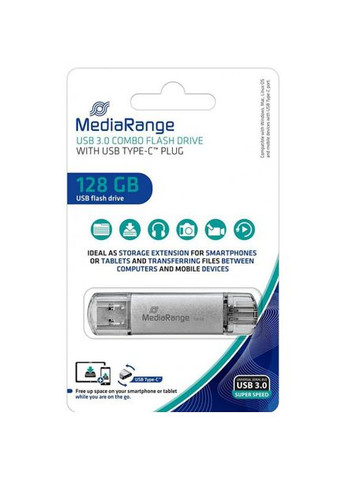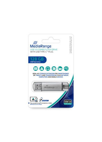 Флеш-накопичувачі MediaRange - це якість та надійність. Наші USB-накопичувачі ідеально підходять для швидкого архівування та обміну даними. USB-з’єднання забезпечує безпечний та зручний доступ до ваших даних – у будь-який час та в будь-якому місці. Завдяки додатковому роз’єму USB Type-C наші комбіновані накопичувачі можна використовувати як зовнішній накопичувач для вашого мобільного пристрою або передачі файлів між вашими пристроями і комп’ютером. Наші комбіновані накопичувачі легко носити із собою, тому ваші дані завжди будуть під рукою. Стильний алюмінієвий корпус дуже міцний і оснащений захисними ковпачками для захисту обох виделок від пилу та бруду, поки ви в дорозі. Характеристики: Об'єм пам'яті: 128 ГБ Швидкість запису: 20 Мб/с Швидкість зчитування: 80 Мб/с Інтерфейс: USB 3.0 / USB Type-C Матеріал корпусу: метал Гарантія, міс: 24