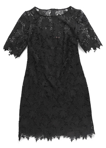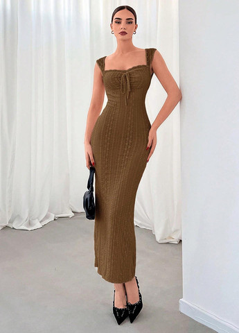 Сукня з відкритою спиною, контрастним мереживом та розрізом. Вона має елегантний стиль із вирізом на тонких бретельках та силуетом без рукавів. Виготовлена із трикотажного полотна середнього ступеня еластичності, вона щільно прилягає до тіла. Сукня довжиною до коліна має олівцевий низ та природну лінію талії.