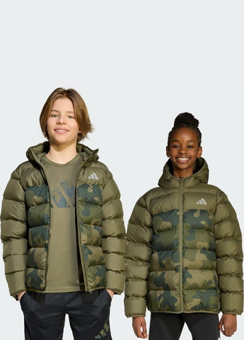 Світловідбивні деталі 100% перероблений поліестер CLIMAWARM Застібка-блискавка Кишені на блискавці Стандартний крій Ця куртка adidas для підлітків зігріє і захистить у холодні дні. Утеплювач утримує тепло, а підкладка на капюшоні додає додатковий захист. Камуфляжний принт спереду і відбиваючий логотип на грудях надають сучасний і стильний вигляд. Технологія CLIMAWARM зберігає тепло і ефективно відводить вологу, забезпечуючи сухість і комфорт під час активних ігор і прогулянок. Термоізоляція і водовідштовхувальна тканина захищають від негоди, роблячи цю куртку ідеальним вибором для зимових пригод.