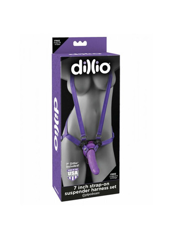 Страпон Dillio, з підтяжками для надійної фіксації, фіолетового кольору Страпон дозволяє дівчині зайняти активну позицію по відношенню до своєї другої половинки, на власному досвіді відчувши, як це, бути «верхнім» і управляти процесом сполучення. Аксесуар містить складну систему кріплення на стегнах і плечах, яка запобігають сповзання страпона, забезпечує легкість рухів і при цьому дозволяє активно управляти насадкою. Система Harness дозволяє кріпити фалоси різних розмірів, для цього в комплекті є три кільця різних діаметрів. Характеристика: Маленьке кільце: діаметр зовнішній - 4 см; внутрішній - 3,1 см Середнє кільце: діаметр зовнішній - 5,2 см; внутрішній - 4 см Велике кільце: діаметр зовнішній - 6 см; внутрішній - 5,3 см Довжина фалоса в комплекті - 19.1 см., в діаметрі 4.6 см., він виготовлений з якісного ПВХ, не містить фталатів. У комплект так само входять лубрикант і засіб для очищення іграшок. Штрихкод: 603912744545