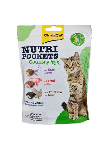 Вітамінні ласощі GimCat Nutri Pockets Кантрі мікс – хрусткі подушечки зі смачною начинкою. Качка, яловичина та індичка надзвичайно смачні, а також містять вітаміни A, D3 і E. Разом вони активізують власні захисні сили організму і додають життєвих сил. Рекомендації з годування: пригощайте вашого котика ласощами Nutri Pockets до 20 шт. на день. Завжди слідкуйте за тим, щоб в улюбленця була свіжа питна вода. Склад: зернові, м’ясо та продукти тваринного походження (Nutri Pockets червоно-коричневі подушечки: яловичина - 4%, Nutri Pockets коричневі подушечки: качка - 4%, Nutri Pockets темно- коричневі подушечки: індичка - 4%), олії та жири, екстракти рослинного білка, продукти рослинного походження, мінерали, дріжджі, молоко та молочні продукти. Харчова поживність: білки 31,0 %, жири 20,0 %, сира клітковина 2,5 %, сира зола 6,0 %, вологість 9,0 %. Вітаміни: A: 9.000 МО, Віт. D3: 630 МО, Віт. E: 90 МО, Таурин: 1.000 мг.