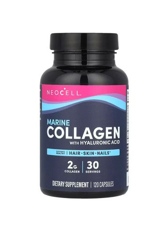 NeoCell Marine Collagen – морський колаген для молодості, здоров'я та зволоження шкіри. Близько чверті всього білка в організмі є колагеном. Кістки та зуби сформовані шляхом додавання мінеральних кристалів з колагеном. Гіалуронова кислота входить до складу: хрящової тканини, синовіальної суглобової рідини, склоподібного тіла, кровоносних судин, шкіри. Вміст гіалуронової кислоти у шкірі та інших тканинах знижується з віком і це потребує прийому препаратів із вмістом гіалуронової кислоти. Препарат є природним гелеутворювачем, має регенеративні, противірусні, протизапальні, загоювальні властивості. Гіалуронова кислота – джерело біологічно-активної сірки, що сприяє покращенню стану сполучної тканини, вен та судин. Серед активних інгредієнтів продукту Marine Collagen слід виділити: запатентована форма морського колагену, який виступає як будівельний матеріал для сполучних та епітеліальних тканин, м'язів, хрящів, зв'язок та, звичайно ж, шкіри; гіалуронова кислота – розгладжує дрібні зморшки, живить та тонізує шкіру, надає їй здорового блиску, пружності, рівномірного кольору, гладкості, еластичності, покращує гідратацію; мінерали цинк, мідь та кремній – зміцнюють шкірний покрив, беруть участь у багатьох обмінних процесах, необхідних для вироблення та насичення шкіри вітамінами, амінокислотами та іншими нутрієнтами; вітаміни групи В – стимулюють білковий метаболізм, необхідний для відновлення зруйнованих клітин шкіри, і навіть активного оновлення епітелію; вітамін С – найважливіший антиоксидант, що перешкоджає розвитку окисного стресу та впливу вільних радикалів, омолоджує шкіру та уповільнює природне старіння. Поживна цінність в одній порції - 4 капсули: Вітамін C (аскорбінова кислота) – 40 мг Вітамін В6 (піридоксин HCl) – 1,32 мг Вітамін В12 (ціанокобаламін) – 0,4 мкг Магній (оксид магнію) – 132 мг Цинк (оксид цинку) – 3,32 мг Мідь (міді глюконат) – 1,32 мг Морський колаген – 2000 мг Гіалуронова кислота – 20 мг Кремній (діоксид кремнію) – 13,2 мг Інші інгредієнти: Морські желатинові капсули можуть містити рослинний стеарат магнію. Не містить: сою, пшеницю, лактозу, крохмаль, дріжджі або штучні ароматизатори. Попередження про алергени: містить рибу (тилапію). Рекомендації щодо застосування: Приймати по 2 капсули двічі на день. Для максимального засвоєння приймати на порожній шлунок. Зберігати у недоступному для дітей місці.