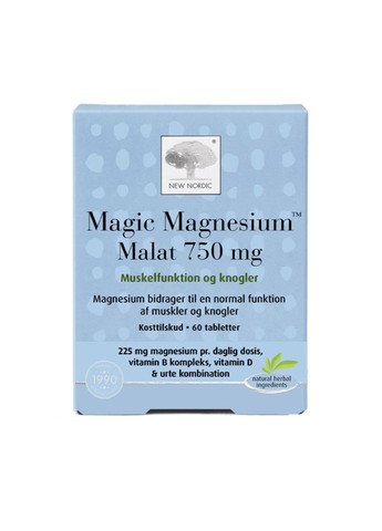 Опис: Магній малат 750 мг. Для м’язів та кісток 750 мг малату магнію забезпечують 225 мг чистого магнію. Магній допомагає підтримувати нормальну роботу м’язів, синтез білка та здоров’я кісток, а також підтримує баланс електролітів. Магній, тіамін, біотин, вітаміни В6 і В12 сприяють підтримці нормального енергетичного обміну. ЩО ТАКЕ МАГНІЯ МАЛАТ? Малат магнію – це сполука, утворена шляхом поєднання магнію та яблучної кислоти. Малат магнію є формою магнію, яка добре засвоюється. Магній допомагає: зменшити почуття втоми та стомлюваність, підтримувати баланс електролітів, підтримувати нормальну роботу м’язів, діяльність нервової системи та енергетичний обмін. Рекомендації щодо застосування: рекомендований для нормального функціонування м’язів і кісток. Допомагає зменшити втому і стомлюваність. Сприяє нормальному функціонуванню нервової системи, а також нормальній психологічній функції. Може бути рекомендована як дієтична добавка до раціону харчування. Спосіб вживання: по 2 таблетки на день: 1 таблетку вранці та 1 таблетку ввечері під час їжі. Перед застосуванням рекомендована консультація лікаря. Особливості застосування: не перевищувати зазначену рекомендовану кількість для щоденного споживання. Дієтичні добавки не слід використовувати як заміну повноцінного раціону харчування. Не є лікарським засобом. Протипоказання: дітям до 11 років, підвищена чутливість до складових компонентів. Вагітним і годуючим жінкам перед застосуванням рекомендується проконсультуватися з лікарем або фармацевтом. Вироблено під фармацевтичним контролем чистоти і вмісту інгредієнтів відповідно до вимог GMP. Без ГМО. Виробник: Нью Нордік Хелсбрендс АБ, Содра Форштадготан 3С, С-211 43 Мальме, Швеція, на заводі Легосан АБ, Віагатан 16, Кумла, СЕ-692 21, Швеція.