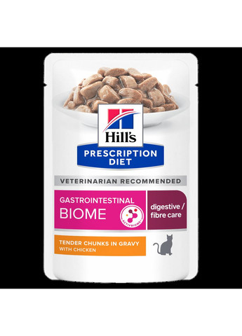 Вологий корм для кішок Hill's Prescription Diet Gastrointestinal Biome, з куркою – повнораційне дієтичне живлення, спеціально розроблене дієтологами та ветеринарними лікарями для покращення травлення, якості та регулярності випорожнень та запобігання рецидивам шлунково-кишкових розладів. Корм Hill's PRESCRIPTION DIET Gastrointestinal Biome має клінічно доведену здатність протягом 24 годин усувати діарею або запор у кішок та знижувати ризик рецидиву. Цей збагачений технологією поєднання інгредієнтів ActivBiome+ корм забезпечує швидке живлення кишкового мікробіома та допомагає усувати складні проблеми із травленням. Переваги: Унікальна запатентована суміш пребіотичних харчових волокон ActivBiome+ швидко налагоджує здорове спорожнення кишечника та покращує травлення, живить мікробіом та вивільняє корисні протизапальні та антиоксидантні речовини, підтримує здорове травлення та гарне самопочуття. Високий вміст розчинної та нерозчинної клітковини допомагають при захворюваннях шлунково-кишкового тракту, що піддаються корекції за допомогою клітковини Омега 3 жирні кислоти (ЕПК та ДГК) переривають цикл запалення Висока перетравність білка сприяє легкому засвоєнню незамінних амінокислот Гарбуз та подорожник є джерелом клітковини для підтримки здоров'я травлення Антиоксиданти вітаміни С та Е зменшують кількість вільних радикалів у клітинах організму та підтримують імунну систему Має відмінний смак, який кішці точно сподобається Рекомендовано: запор (зі збереженням моторики ШКТ) ентеропатія, що піддається корекції за допомогою клітковини (товстокишкова діарея) форми хронічної ентеропатії (запальні захворювання кишечника): – ентеропатія, що піддається корекції за допомогою зміни раціону – антибіотико-залежна / антибіотикоопосередкована діарея – стероїд-залежна ентеропатія інфекційна діарея новоутворення шлунково-кишкового тракту коліт (гострий або хронічний) метеоризм Інші рекомендації: серцеві захворювання легкої та помірної стадії, а також безсимптомні пізні стадії серцевих захворювань Протипоказання: Для кошенят Для котів у період вагітності та лактації Для кішок з хронічною хворобою нирок 2-4 стадії IRIS або з протеїнурією Додаткова інформація Дієтичне живлення Hill's Prescription Diet Gastrointestinal Biome з патентованою технологією ActivBiome+ є унікальною сумішшю пребіотиків, спеціально розроблену дієтологами та ветеринарами для допомоги травній системі для сприяння регулярному здоровому стільцю та підтримки здорового травлення. Клінічно доведено живить мікробіом кишечника, щоб звільнити корисні протизапальні та антиоксидантні сполуки. СКЛАД: М'ясо та субпродукти тваринного походження (курка 21%), продукти рослинного походження, зернові, екстракти рослинних білків, яйця та субпродукти яєць, риба та субпродукти риби, різні цукру, фрукти, мінерали, насіння, олії та жири. Інгредієнти з високою засвоюваністю: курка, свинина, кукурудзяний крохмаль, крохмаль тапіоки, пшеничний глютен, сушені яйця, лосось, мелений рис, мелена пшениця, різні цукри, дигест, мелений ячмінь, рибний жир, кукурудзяний декстр. Суміш пребіотиків ActivBiome+ (2,5%): мелена шкаралупа горіха пекана, насіння льону, сушений буряковий жом, сушений цитрусовий жом, журавлина. Аналітичний склад: Білок 8,9%, жир 4,0%, Сира клітковина 1,2%, Сира зола 1,5%, Волога 75,5%, Кальцій 0,20%, Фосфор 0,16%, Натрій 0,09%, Калій 0,18%, на кг: вітамін А 17345 МО, 