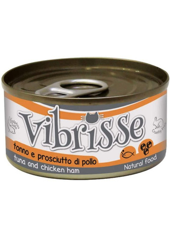 Vibrisse – консерви для кішок супер-преміум класу, виготовлені на пару. Консерви виготовлені лише з добірних інгредієнтів; Без добавок та консервантів. Приготування на пару, що не змінює природний смак інгредієнтів, що виключає необхідність додавати добавки, що змінюють смак; Використання тунця, макрелі та лосося, природно, приносить у раціон поліненасичені жирні кислоти (омега-3 та омега-6), що сприяють фізичному благополуччю вашого вихованця; У складі використовують цілі шматки риби та найкраще м'ясо, щоб забезпечити більшу смакову насиченість; Підходить для всіх порід кішок Термін зберігання відкритої консерви 48 годин, що свідчить про її натуральність. Склад: курка-57%, куряча шинка-3%, рис-3%, вода-37%. Без барвників та консервантів. Гарантований аналіз: протеїн-11%, жир-0,1%, клітковина 1%, зола-2%, вологість-85,5%.