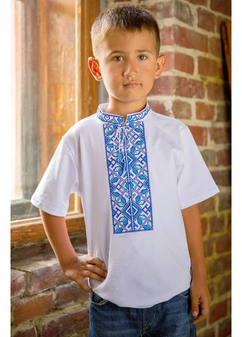 Вишиванка для хлопчика Lesia Подільська бірюза з вишитим комірцем-стійкою, короткий рукав Трикотажна вишиванка Подільська поєднує традиції старовини і модні тенденції сьогодення. Візерунок бірюзового кольору в поєднанні з голубими відтінками гармонійно та яскраво виглядає на білому фоні вишиванки. Машинна вишивка виконана хрестиком. Комірець-стійка також оздоблений вишивкою. Такий національний одяг можна сміливо комбінувати з джинсами чи піджаком, що підкреслить індивідуальність кожного юнака та стане стильним акцентом гардеробу. Розміри 92,104,116,128,140,152. Вишивка машинна. Дитячі вишиванки гуртом та в роздріб.