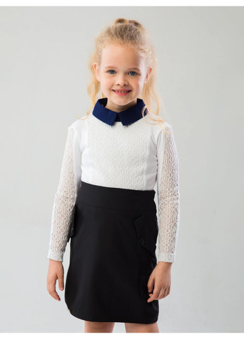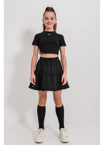 Спідниця довжиною вище лінії колін, розширена до низу. Модель виконана з щільної тканини з формостійкою структурою, що зберігає об’єм виробу. Верхня частина оформлена кокеткою зі скошеними лініями, які візуально подовжують фігуру. Низ виробу декорований двошаровим рюшем із білої тканини, що виступає з-під основного шару, створюючи контраст та додатковий об’єм.