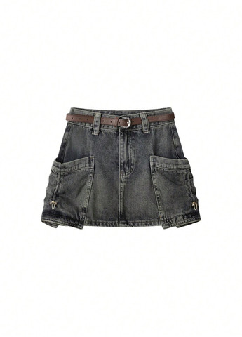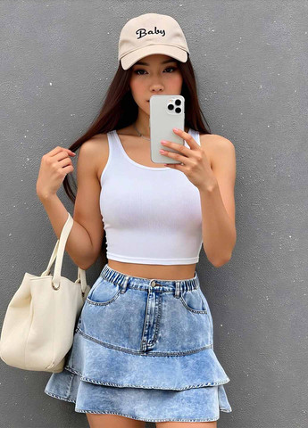 Ця джинсова спідниця створена для повсякденного носіння. Має природну лінію талії, коротку довжину та вільний крій. Спідниця має дві кишені та застібку-блискавку. Виготовлена з нееластичної джинсової тканини.