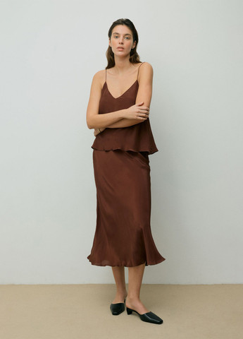 Спідниця з віскози коричнева. Витончена міді-спідниця по косій – ідеальний вибір для стильних та комфортних образів. Виготовлена з 100% віскози, вона м’яко лягає по фігурі, створюючи жіночний силует. Пояс на резинці з фістонами додає ніжного акценту та забезпечує зручну посадку.