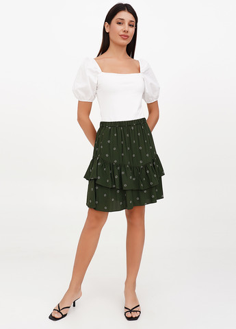 Спідниця триярусна, квітковий принт з люрексом, максі, на підкладці, без застібки, широкий прострочений пояс на резинці, боковий розріз, рюши. На розмір М - напівобхват поясу - 39 см (тягнеться до 55 см), довжина по боковому шву - 92 см. Без паперової бирки бренду.