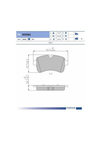 Колодки гальмівні дискові ЗАДН AUDI A4 04-08. A6 04-11. A8 02-10 КОД ТОВАРУ FO 815281 АРТИКУЛ ТА ВИРОБНИК ТОВАРУ FO 815281 (FOMAR Friction) Характеристика Властивість Висота 58,60 мм Гальмівна система TRW Номер WVA 23326 Сторона монтажу Задня вісь Товщина 17,40 мм Ширина 116,30 мм КАТАЛОЖНІ НОМЕРИ АНАЛОГІВ Виробник Артикул Виробник Артикул Виробник Артикул ASHIKA 51000907 ATE 13046028882 ATE 13046028892 ATE 13047028882 AUDI 4F0698451 AUDI 4F0698451G AUDI 4F0698451F AUDI 4F0698451C AUDI 4E4698451A AUDI 4E4698451 AUDI 4E0698451B AUDI 4E0698451A AUDI 4B3698451A AUDI 4B3698451 AUDI 4F0698451H AUDI 7H0698451A AUDI 8E0698451C AUDI 8E0698451H AUDI 8E0698451N BLUE PRINT ADV184228 BOSCH 0986494583 BOSCH 0986424056 BREMBO P85076 CHAMPION 573219CH DELPHI LP1920 EUROREPAR 1639377180 FERODO FDB1655 FTE BL1872A3 LPR 05P1398 MAGNETI PF0602 MANDO MBF015375 MANDO MBF015195 METELLI 2205542 PROFIT 50051655 SEAT 4E0698451B SEAT 4E4698451 SKODA 4E0698451B SKODA 4E4698451 TRW GDB1516 TRW GDB1769 TRW GDB1661 VW 4E0698451B VW 4E4698451 VW 4F0698451C VW 4F0698451G VW 7H0698451A VW 8E0698451N ЗАСТОСУВАННЯ Марка / Модель Марка / Модель Марка / Модель Колодки Audi A4 B6 (8E2) Колодки Audi A4 B6 Avant (8E5) Колодки Audi A4 B6 Кабріолет (8H7) Колодки Audi A4 B7 (8EC) Колодки Audi A4 B7 Avant (8ED) Колодки Audi A6 C5 (4B2) Колодки Audi A6 C5 Avant (4B5) Колодки Audi A6 C6 (4F2) Колодки Audi A6 C6 Avant (4F5) Колодки Audi A6 Allroad C6 (4FH) Колодки Audi A8 D3 (4E2, 4E8) Колодки VW MULTIVAN T5 (7HM, 7HN, 7HF, 7EF, 7EM, 7EN) Колодки VW TRANSPORTER T5 Автобус (7HB, 7HJ, 7EB, 7EJ) Колодки VW TRANSPORTER T5 Фургон (7HA, 7HH, 7EA, 7EH) Колодки VW TRANSPORTER T5 Платформа/шасі (7JD, 7JE, 7JL, 7JY, 7JZ, 7FD,