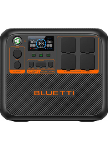 Зарядна станція BLUETTI AC200PL потужністю 2400 Вт являє собою універсальний пристрій для забезпечення автономного живлення різних приладів і пристроїв. Вона оснащена чотирма розетками AC 230В, двома портами USB Type-C з підтримкою швидкого заряджання за протоколом PD, двома портами USB Type-A з підтримкою QC 3.0, одним DC-виходом, автомобільною розеткою (прикурювачем) і двома зонами для бездротового заряджання потужністю 15 Вт кожна. Номінальна потужність станції становить 2400 Вт, з піковими значеннями до 3600 Вт, що дає змогу живити навіть вимогливі пристрої. Усередині станції встановлена довговічна літій-залізо-фосфатна (LiFePO4) батарея ємністю 45000 мА-год (2304 Вт-год), що забезпечує понад 3000 циклів зарядки. Станція BLUETTI AC200PL також підтримує функцію ДБЖ (джерело безперебійного живлення), забезпечуючи захист підключених пристроїв від перебоїв в електропостачанні. Зарядка самої станції можлива як від мережі змінного струму (AC) з потужністю до 2400 Вт за 1,5 години, так і від сонячних панелей з потужністю до 1200 Вт за 2,5 години, що робить її зручною для використання в будь-яких умовах. У комплект входить можливість підключення сонячної панелі. Додатково пристрій оснащений дисплеєм для моніторингу роботи, має вбудовані контролери MPPT і BMS для оптимального управління зарядкою і безпекою, а також зручну ручку для перенесення. BLUETTI AC200PL важить 28,8 кг і має габарити 420x280x366,5 м