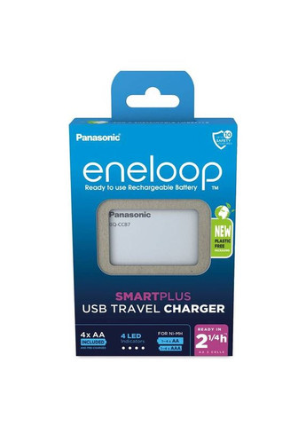 Panasonic BQ-CC87 — легкий і компактний зарядний пристрій для підзарядки акумуляторів типу АА і ААА. Зарядний пристрій Panasonic BQ-CC87 можна використовувати як повербанк для зарядки мобільних пристроїв та гаджетів від попередньо заряджених акумуляторів АА або ААА. Працює зарядний пристрій Panasonic BQ-CC87 від будь-якого USB-джерела живлення (мережевий адаптер USB 5V, автомобільний USB адаптер, USB-порт комп’ютера, ноутбука) що забезпечує зручність та універсальність підключення. Компактні розміри, мала вага та універсальність підключення дарують комфорт у використанні і дозволяють взяти зарядний Panasonic BQ-CC87 з собою в будь-яку поїздку. Також до комплекту разом з зарядним пристроєм йдуть 4 акамуляторні батарейки типу АА. Цей пристрій відрізняється не тільки функціональністю, а й практичністю використання, адже він може працювати від USB-портів. Компактні розміри та невелика вага роблять його незамінним помічником для швидкого заряджання акумуляторів та електроніки під час подорожей. У комплекті до зарядного пристрою також йдуть 4 акумулятори Eneloop типу АА на 2000 мАг.
