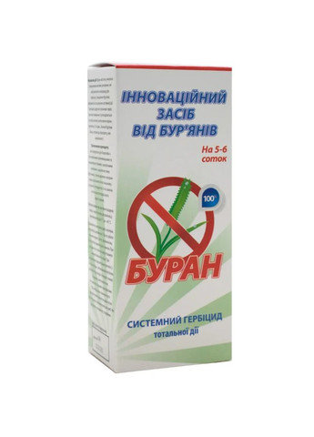 Буран, 100 мл Перед обробленням не треба полоти та терти бур'ян. Як і де застосовувати? на ділянках під посів будь-якої культури або розбивання газону навколо садильних будівель уздовж парканів, доріжок у придульних колах в саду, городі, квітнику: спрямована обробка бур'янів Форма препарату: водний розчин Активна речовина: гліфосат у формі ізопропіламінної солі, 480 г/л. Гарантійний термін зберігання - 5 років. Ефективний несективний гербіцид широкого спектра дії знищує всі бур'яни, чагарники та небажані дерева Застосування: у період активного росту бур'янів із весни до пізньої осені Механізм дії: препарат поглинається листям і переноситься по всьому рослині, включно з кореневою системою. Листя багаторічних бур'янів червоніє або жовтіє через 7-10 днів. Повністю бур'яни гинуть через 2-3 тижні. Як і де застосовувати? Об'єкт оброблення Робочий розчин Площа оброблення Ділянки, призначені під посів і посадку культур 50 мл на 9 л води 250-300 м2 Ділянки, призначені під газон 100 мл на 11 л води Коли не застосовувати? менш ніж за 3 години до дощу в спеку, у разі сильного похолодання, під час перевладження у разі сильного вітру Не допускайте потрапляння розчину препарату на листя й пагони культурних рослин! після оброблення 5-7 днів не розпушувати ґрунт або механічне видалення бур'янів. Механізм дії: Буран містить унікальні поверхнево-активні речовини, які забезпечують найкращу дію гліфосу. Знищення бур'янів відбувається завдяки системній дії. Препарат дифузно проникає через листову поверхню й розподіляється на всій рослині, включно з коренем упродовж 2-3 годин. Злакові бур'яни більш чутливі до препарату, ніж широколичні. Призначення препарату: застосовується для боротьби з багаторічними кореневищними та коренеприсхильними, однорічними злаковими та широколистими бур'янами, а також деревно-кухарниковою рослинністю в сільському та лісовому господарстві, і на землях несе сільськогосподарського користування. Зберігати окремо від харчових продуктів і ліків, у недоступному для дітей місці за температури від 0 °C до +40 °C. Працювати в захисному одязі, окулярах, респіратері, рукавичках. Під час роботи не можна курити, пити, вживати їжу. Після роботи вимити руки з милом. У разі потрапляння в очі або на шкіру промити великою кількістю води. У разі випадкового ковтання випити 2-3 склянки води з активованим вугіллям. Зверніться до лікаря. Антидота немає. Лікування симптоматичне. Не сумісний з іншими препаратами. Робочий розчин має бути використаний упродовж доби після приготування. Небезпечний для риб. Не допускати потрапляння у водойми.