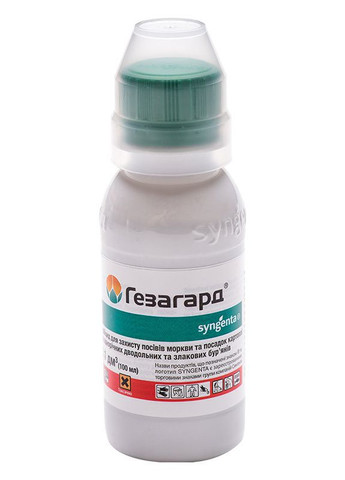 Гезагард 100 мл - сиcтeмний вибіркової дії, який використовується для захисту плодів моркви, бобових рослин, картоплі, кукурудзи, інших технічних і овочевих культур. Препарат пригнічує ріст дводольних (портулак городній, осот городній, чортополох жовтоквітковий, волошка синя) і злакових (лисохвіст польовий, ситник жаб'ячий, пажитниця, плоскуха та ін.) бур'янів. Опис Гезагард 100 мл Під час обприскування препарат проникає через листя та знищує бур'ян разом з коренем. Вбирання гepбіциду відбувається і на етапі проростання бур’янів, завдяки чому можна запобігти появі сходів. Переваги: Здатний повністю розкластися в ґрунті під час періоду вегетації, не впливаючи на наступні рослини в сівозміні. Пригнічує ріст однорічних дводольних і злакових бур'янів, в. т.ч. і різновиди, що важко викоріняються. Захищає широкий спектр рослин – один препарат використовується для обробки багатьох культур. Захисна дія препарату «Гезагард» триває від 35 до 45 днів, що підвищує ступінь захисту врожаю. Особливості використання: Діюча речовина: 500 г / л прометрину. Застосовується "Гезагард" перед посівом культури або до появи її сходів. Обробка проводиться один раз в сезон. Для обробки 1 сотки, достатньо 5 літрів готового розчину. Обприскування препаратом «Гезагард» рекомендується проводити вранці або ввечері при безвітряній погоді, щоб запобігти потраплянню на інші культури. Після обробки ґрунту гербіцидом, протягом 35-45 днів, не бажано проводити розпушування ґрунту. Інструкція: Діюча речовина: 500 г / л прометрину. Культуpa Норма витрати препарату 10л/2 сотки Період обприскування Шкідливі об'єкти Картопля 60-80 мл на 10 л води Після посадки але до появи сходів Однорічні дводольні й злакові бур'яни Морква 40-60 мл на 10 л води Обприскування ґрунту до появи сходів або у фазі 2-4 справжніх листки Однорічні дводольні й злакові бур'яни Горох 40 мл на 10 л води Обприскування до появи сходів Однорічні дводольні й злакові бур'яни Соняшник 60-80 мл на 10 л води Обприскування ґрунту до появи сходів або у фазі 2-4 справжніх листки Однорічні дводольні й злакові бур'яни Квасоля 60 мл на 10 л води Обприскування до посіву, після посіву, але до появи сходів Однорічні дводольні й злакові бур'яни