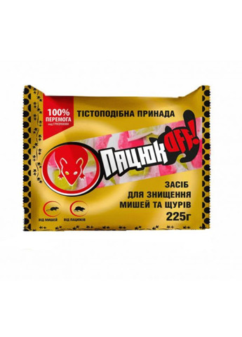 Пацюк Оф тісто 2 цвета 2 аромата Засіб дозволений до застосування в житлових і нежитлових приміщеннях. Переваги: Знищує й муміфуцує гризунів на 100% Приманює мишей і щурів Засіб готовий уже для використання Сучасні технології рецептури паковання, забезпечує застосування засобу в приміщеннях і відкритих просторах без зниження ефекту Форма випуску: готовий для застосування родентицидний засіб у формі тіста у фільтр пакетах жовтого та червоного кольору, з ароматом сиру, арахісу, фасоване в тару з полімерних матеріалів. Призначення: для знищення м'язових гризунів (миша, щурів) в умовах побуту. Засіб дієвий навіть у разі резистентності (виявлення) гризунів до інших приманок. Миші та щури з легкістю приманюються особливими речовинами, які є в засобі, і гинуть упродовж 3-7 днів після з'їдання засобу. Процес отруєння гризунів не викликає занепокоєння в інших м'язових, гризуни гинуть у відкритому просторі, унаслідок задухи. Зверніть увагу! Засіб потрібно постійно додавати, не допустивши його повного поїдання. До повного зникнення гризунів! Склад: Їстівна основа (суміш їстівних компонентів), приманки, гіркота та інші допоміжні речовини, активна речовина — Бродифакум (0,005%). Методи безпеки: Тримати засіб у місцях, недоступних для дітей і тварин. Не домагатися засобу не захищеними руками. Розкладати засіб необхідно пінцетом або в гумових рукавичках. У разі потрапляння засобу на шкіру, промити великою кількістю води з милом. Під час роботи з засобом не можна вживати їжу, питво або курити. У разі потрапляння засобу в шлунок, терміново звернутися до лікаря. Після завершення робіт із засобом, паковання, залишки засобу та трупи гризунів зібрати та закопати в землю на глибину) 0,5 метра. Протидіє: Вітамін К1 (фітомадіон). Умови зберігання: у темному, сухому місці за температури від -15 до +30 і відносної вологості повітря не більш ніж 85%. Спосіб застосування: приманку висипають або розкладають за допомогою совка на шматочки картону, поліетилену, у невеликій кількості. Засіб є малотоксичним (4 клас небезпеки). Термін придатності та зберігання: 36 місяців.