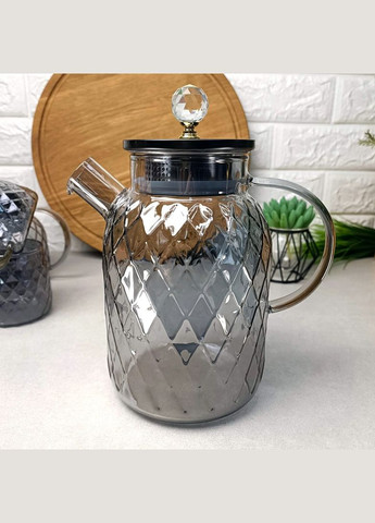 Чайник із термостійкого боросилікатного скла 1000мл з чорним переливом Призначення: Для води, чаю та соку. компоту, узвару, чаю Матеріал: Скло. Об'єм: 1 л. Діаметр 8/13,5 см Висота 13/17,5 см Металевий фільтр-спіраль у носику Забарвлення: Однотонний. Основний колір: чорний перламутр Упаковка: технічна Можливість миття у посудомийній машині: Так. Можна гріти на плиті Діапазон температур -20/+150 Скляний чайник для заварювання чаю для гарячих напоїв Преміум-класу Виготовляється з термостійкого скла високої якості. Великий обсяг дозволить розливати напої у великій кількості. Кришка виготовлена з бамбука та силікону Також у нашому асортименті є чашки з цієї ж алмазної серії