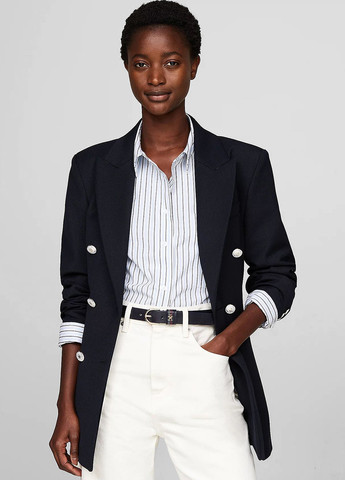 Колекція студії. Однобортний піджак вільного крою oversize з повітряної суміші льону і віскози з тонким блиском. Похилий плечі, характерні підплічники, виточки на талії і закруглені рукави зі складками, які ще більше підкреслюють повсякденний силует. Комір, широкі загострені лацкани та манжети на гудзики. Прорізна кишеня на грудях, передні кишені з окантовкою та внутрішня кишеня з окантовкою. Розріз ззаду. Підкладка із віскози.