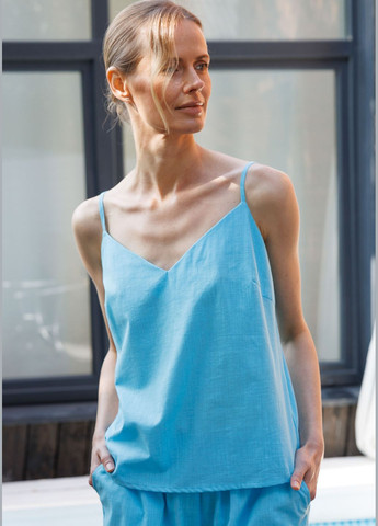 Класичний домашній костюм: майка і шорти. Для його створення використовується приємний віскозний трикотаж з квітковим принтом. Комплект прикрашений яскравою контрастною Бейко. Спереду на майці є невелика складка по центру виріз горловини. Силует напівприлеглий, дарує відчуття комфорту і приховує недоліки фігури. Шорти прямі, з боковими кишенями. В пояс вставлена еластична тасьма.