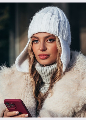 Шапка-вушанка дрібної в'язки. Утеплена смужкою з мікрофлісу "Polar". Колір виробу - білий. Виріб розрахований на окружність голови 56-59 см.
