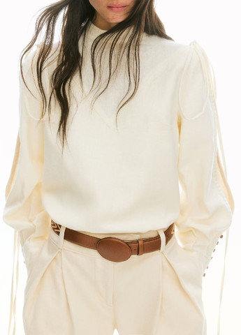 Блузка вільного крою з легкої фактурної тафти з драпірованим коміром-стійкою, що спереду переходить у широкі стрічки, що зав'язуються великим бантом. На одному плечі – розріз на гудзику, сильно спущена лінія плеча, довгі рукави-ліхтарики з широкими манжетами, кожна з яких з розрізом і гудзиком. Поділ затягується збоку шнурком. Всі гудзики куполоподібні та прикрашені стразами.