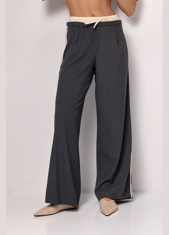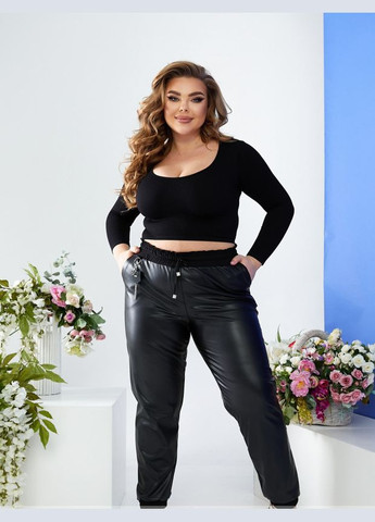 Жіночні штани з м'якої штучної шкіри з високою посадкою та трохи звуженим кроєм. Низ декоровано люверсами зі знімним кільцем, яке при необхідності можна зняти та виріб буде вільного крою. Пояс виконано з трикотажу Алекс, який переходить в бокові вставки. Виріб доповнено бічними кишенями. М'який та приємний на дотик матеріал зі зворотної сторони подарує додатковий комфорт. На штанах є імітація ширінки, а також вертикальні виточки від талії, які зроблять силует більш витонченим. Орієнтовні заміри готового виробу: 48 р-р: довжина брюк по внутрішньому шву 72 см, довжина брюк по зовнішньому шву з урахуванням пояса 100 см, ОТ-74/82 см, ОС-100 см. 50 р-р: довжина брюк по внутрішньому шву 72 см, довжина брюк по зовнішньому шву з урахуванням пояса 100 см, ОТ-80/92 см, ОС-104 см. 52 р-р: довжина брюк по внутрішньому шву 72 см, довжина брюк по зовнішньому шву з урахуванням пояса 100 см, ОТ-84/96 см, ОС-108 см. 54 р-р: довжина брюк по внутрішньому шву 72 см, довжина брюк по зовнішньому шву з урахуванням пояса 100 см, ОТ-88/102 см, ОС-114 см.