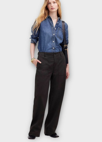 Штани багі Madewell Low-Slung Baggy, однотонні, мішкуватий широкий крой та утилітарні деталі, такі як накладні кишені та регульована стрічка на талії, застібка на блискавці та гудзику, сзаду дві прорізні кишені з клапанами на гудзиках, спереду дві накладні кишені з відрізним бочком, на розмір 25 - напівобххват поясу - 39 см, напівобхват стегон - 52 см, довжина по внутрішньому шву - 7 см, довжиина по ббоковому шву - 107 см, ширина по низу (напівобхват) - 25 см.