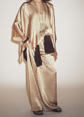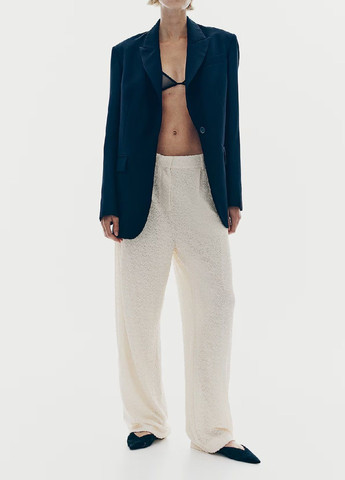 Прямі штани з високою талією з сітки з паєтками, застібкою-блискавкою, потайним гудзиком та застібкою на гачок. Зверху на трикотажній підкладці. Внутрішня частина штанини: довжина: 75,5 см (розмір 40), талія: окружність: 78,9 см (розмір 40).