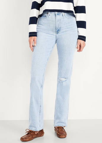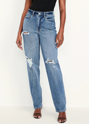 Жіночі джинси Old Navy. Стильні джинси із високою посадкою. Модель Curvy, розроблена для жінок із широкими стегнами. Якщо різниця між талією та стегнами більше 5 см – ці джинси створені для вас. Позаду дві класичні накладні кишені. Застібаються на гудзик і блискавку. Класична модель з п'ятьма кишенями. Є петлі для ременя. Рвані елементи на колінах, елементи потертостей біля кишень. Відмінна якість.