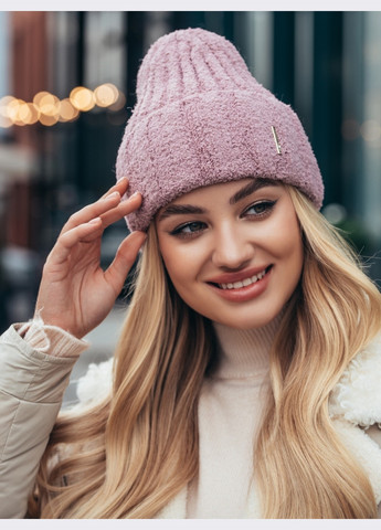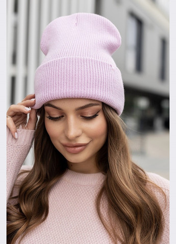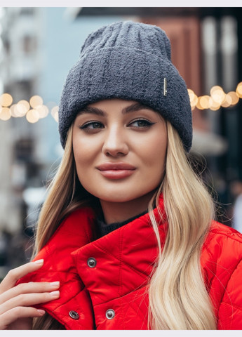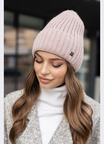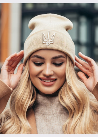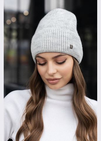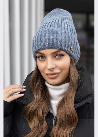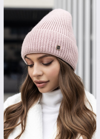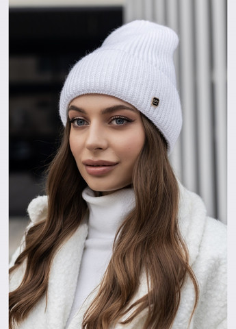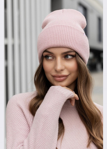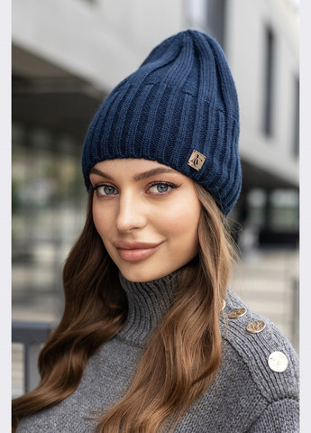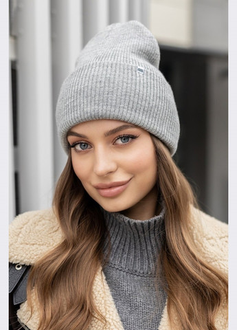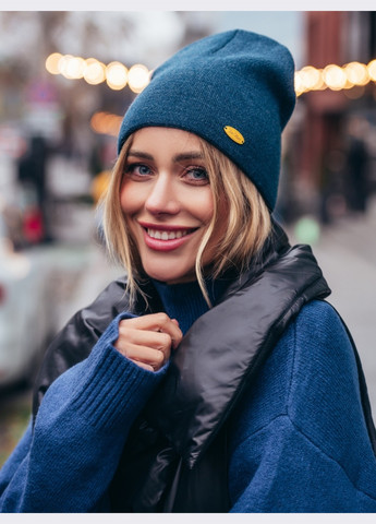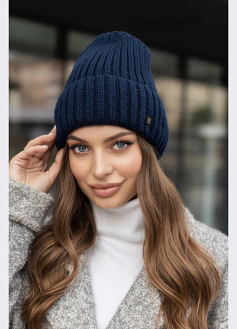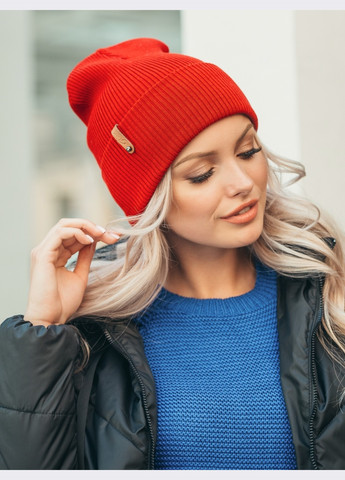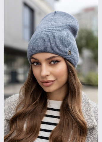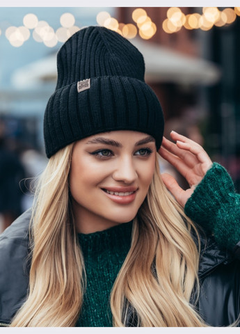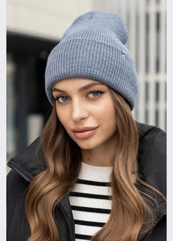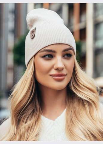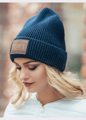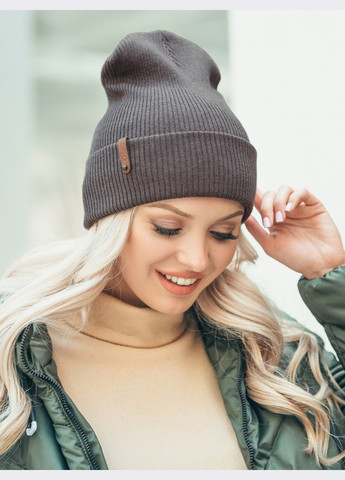 Шапка-біні дрібної в'язки з підворотом. Виріб без флісу. Декорована нашивкою.
