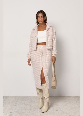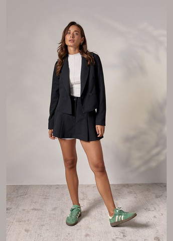 Цей стильний комплект поєднує елегантність жакета та комфорт спідниці-шортів. Жакет з двобортною застібкою і піджачним коміром додає класичної витонченості образу. Перед з декоративною кишенею та талієвими виточками підкреслює фігуру, а втачні довгі рукави з двошовними манжетами та шлицями на низу надають жакету стильного вигляду. Спідниця-шорти з високою посадкою прекрасно фіксує талію, створюючи елегантний силует. В складку, вона ідеально підкреслює форму та додає динамічності образу. Застібка на блискавку та петлю ґудзик спереду додає зручності.
