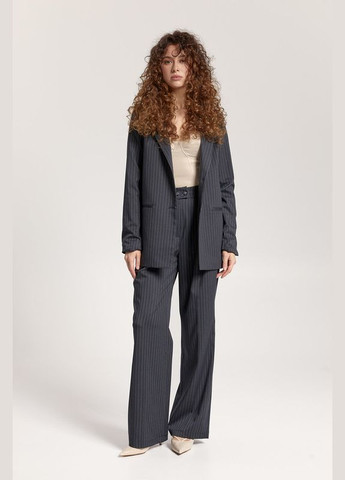 Жакет: двобортна застібка, комір піджачного типу, декоративна кишеня на передній частині, талієві виточки, втачні рукави з двошовними манжетами.