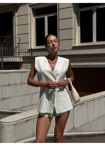 Костюм з шортами та жилеткою — ідеальний вибір для стильного образу 🤍 Комплект виконаний у трендовому силуеті: подовжена жилетка без рукавів з двобортною застібкою та високі шорти з кишенями, які візуально подовжують ноги. Розмір універсальний — комфортно сідає завдяки вільному крою та якісній тканині. Жилетка на підкладці, шорти на блискавці і резинці для комфортної посадки Стильний, легкий і багатофункціональний — носіть з бра-топом для сміливого street style або з базовою футболкою для більш casual образу. ✨ У комплекті: шорти + жилетка 🔹 Матеріал: 65% котон + 35% поліестер 💎 Колір: молочний Заміри: жилетка: довжина 65 см, плечі 40 см, груди до 92 см шорти: талія 58-70 см, стегна до 100 см, довжина по боковому шву 30 см